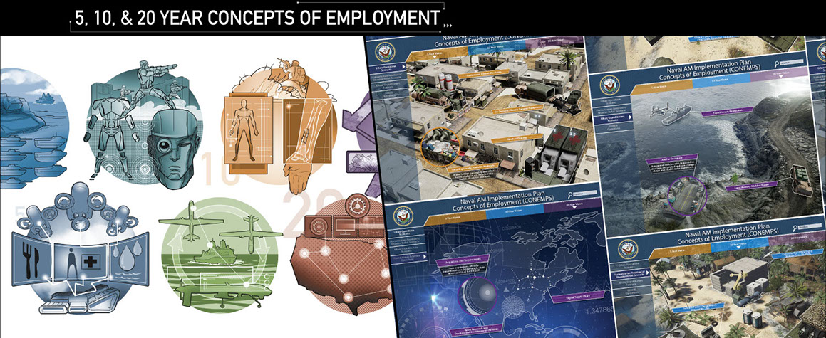 FOCUS designed a SharePoint web portal for the U.S. NAVY and U.S. Marine Corps to demonstrate how Additive Manufacturing (AM) applications are could be used in 4 unique scenarios, and 3 distinct future timeframes: 5, 10, & 20 years.